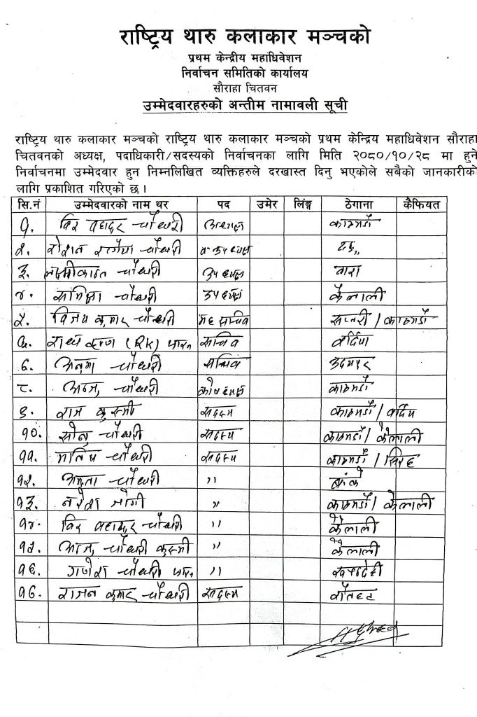 शनिबारबाट सौराहामा सुरु भएको अधिवेशनले अध्यक्ष चौधरी सहित १७ सदस्यीय कार्यसमिति पनि सर्वसम्मत चयन भएका हुन् । कार्यसमितिको अन्य पदाधिकारीहरुमा क्रमशः वरिष्ठ उपाध्यक्ष रोशन रत्गैंया चौधरी (दाङ), उपाध्यक्षमा लक्ष्मीकान्त चौधरी (बारा) र समिक्षा चौधरी(कैलाली), महासचिवमा बिजय कुमार चौधरी, (सप्तरी) सचिवमा राधा कृष्ण (आरके) चौधरी (बर्दिया) र अनुमा चौधरी(उदयपुर), कोषाध्यक्षमा अन्जु चौधरी (काठमाण्डौं) चयन भएका छन् ।
