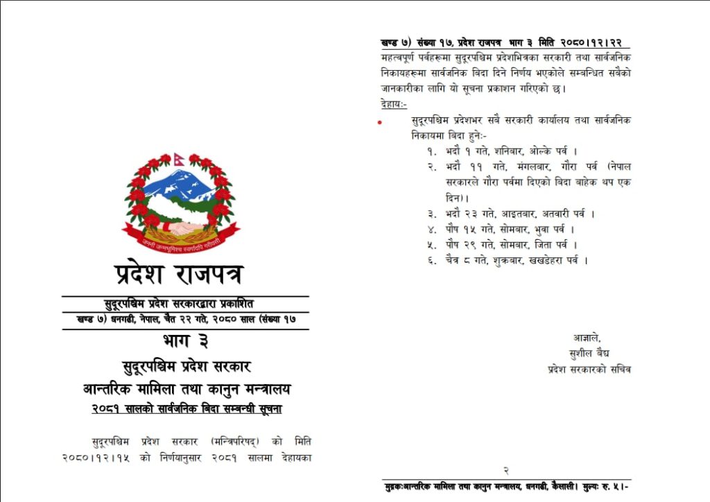 धनगढी, ७ चैत । सुदूरपश्चिम प्रदेशमा भोलि चैत ८ गते सार्वजनिक बिदा दिइएको छ । राना थारू समुदायले मनाउने परम्परागत ‘खखडेहरा पर्व’ का अवसरमा प्रदेश सरकारले शुक्रबार एक दिन प्रदेशभर सार्वजनिक बिदा दिएको हो ।