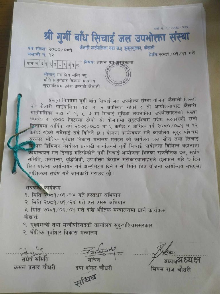 यसै बिच किसानहरूले सुदूरपश्चिम प्रदेशको भौतिक पूर्वाधार विकास मन्त्रालयमा धर्ना दिएका छन् । सिँचाइको लागि सरकारले बर्सेनि बजेट विनियोजन गरे पनि कार्यान्वयन नभएपछि आजित भएका किसानहरूले धर्ना दिएका हुन् । साथै किसानहरूले भौतिक पूर्वाधार विकास मन्त्री कैलाश चौधरीलाई योजना कार्यान्वयन लागि अल्टिमेटमसहितको माग पत्र बुझाएका छन् । योजना कार्यान्वयन नभए चरणबद्ध रूपमा सङ्घर्षको कार्यक्रम गर्ने गुरगी योजना सङ्घर्ष समितिका संयोजक चौधरीले चेतावनी दिए ।