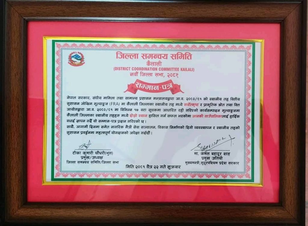 जिल्ला समन्वय समितिको नऔं जिल्ला सभाको अवसरमा गाउँपालिकालाई सम्मान गरेको हो । सुदूरपश्चिम प्रदेशका मुख्यमन्त्री एवं कार्यक्रमका प्रमुख अतिथी कमल बहादुर शाहले गाउँपालिका अध्यक्ष गणेश चौधरीलाई सम्मान गरेका हुन् ।