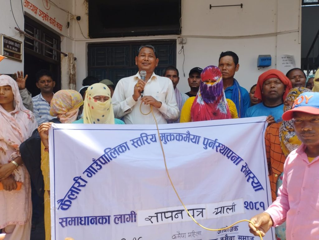 मुक्त कमैया समाज कैलारी ओ कमैया महिला जागरण समाज कैलालीके अगुवाइमे बुधके रोज कैलारी गाउँपालिका स्तरिय मुक्तकमैया पुर्नस्थापना समस्या समाधानके लाग आन्दोलन सहित पुगल टोलीसे ज्ञापनपत्र बुझाइल हो ।