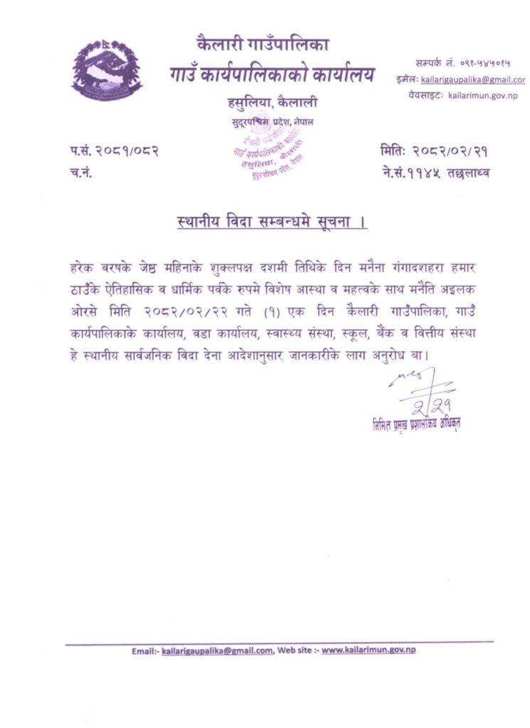 धनगढी, २१ जेठ । कैलालीको धनगढी उपमहानगरपालिका–१६ रामपुरस्थित बेहडाबाबा मन्दिरमा लाग्ने गङ्गा दसहरा मेलाको अवसरमा कैलारी गाउँपालिकाले स्थानीय सार्वजनिक बिदा दिएको छ । गाउँपालिकाले एक सूचना जारी गर्दै जेठ २२ गतेका दिन सार्वजनिक बिदा सम्बन्धी जानकारी गरेको हो ।
