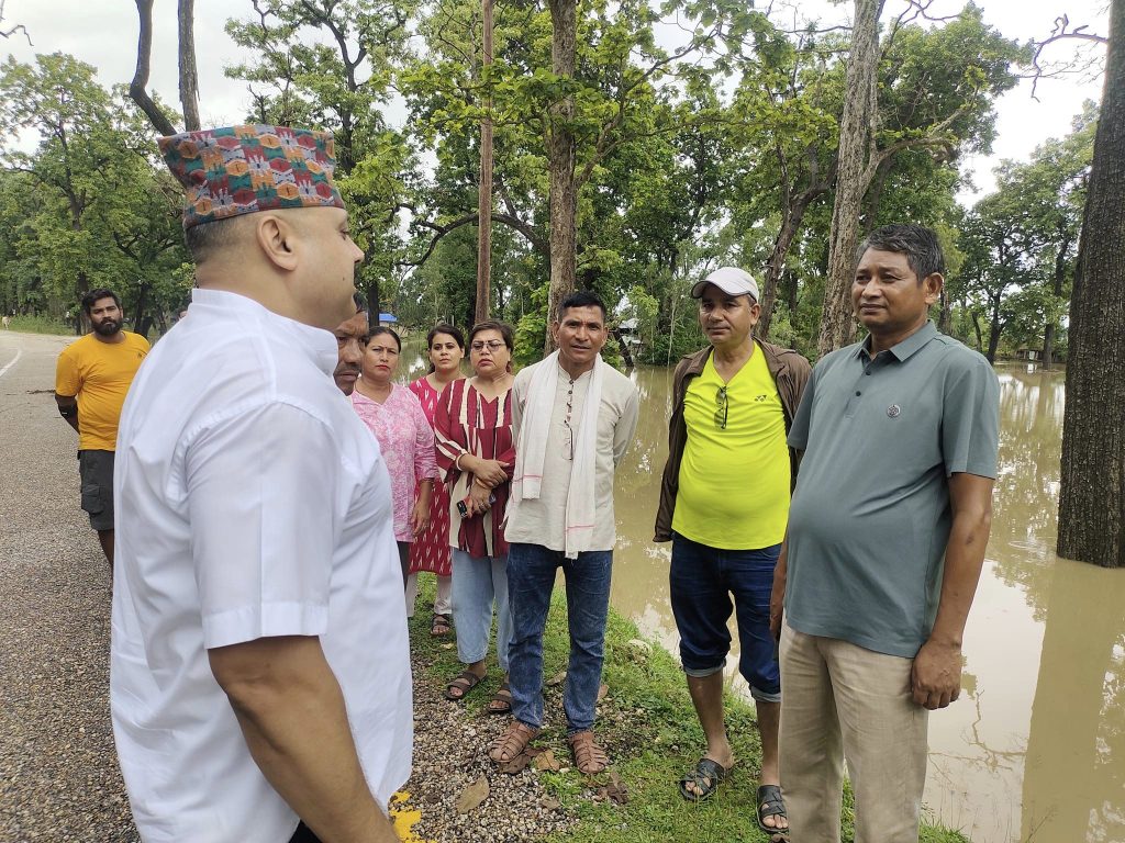 यसै बिच विहीबार कैलालीका प्रमुख जिल्ला अधिकारी धर्मेन्द्र कुमार मिश्र, गाउँपालिका अध्यक्ष राजसमझ चौधरी, कैलाली सिमा ससस्त्र प्रहरी प्रमुख दल बहादुर पाण्डेय, खोनपुर ससस्त्र प्रहरी प्रमुख गान्धिप राज स्याङतान, ईलाका प्रहरी हसुलियाका इन्चार्ज लोकेन्द्र चन्द, वडा अध्यक्ष, प्रमुख प्रशासकिय खगेन्द्र जोशी, सुचना अधिकारी यगम कलेल लगायतको टोलीले बाढी प्रभावितहरुको समस्या बुझेका थिए ।