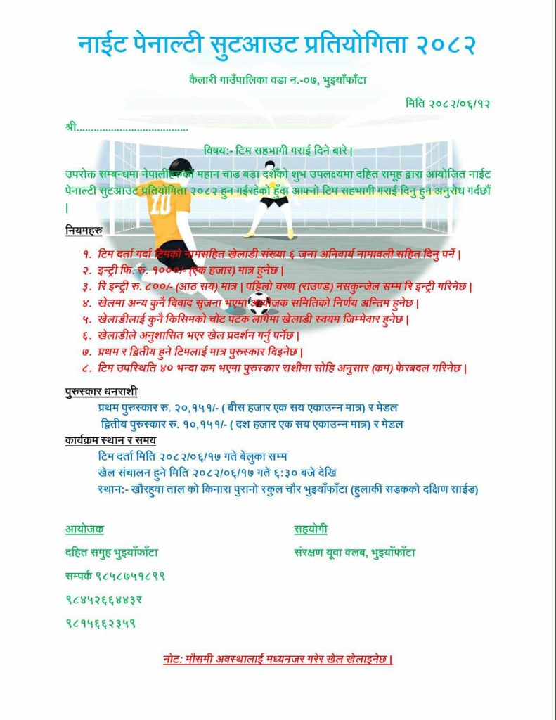 हसुलिया, १२ असोज । दसैँको अवसरमा कैलारी गाउँपालिका वडा नम्बर ७ भुँइयाफाँटामा नाइट पेनाल्टी सुटआउट प्रतियोगिता २०८२ हुने भएको छ ।