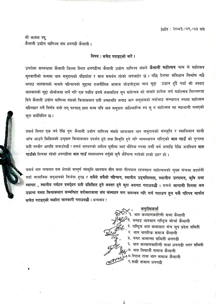 धनगढीमा जारी रहेको महोत्सवमा कला, संस्कृति दर्शाउनका लागि थारु गाउँ राखिएको छ। तर, त्यसको दुर्दशा र त्यहाँको गतिविधिले थारु समुदायलाई बद्नाम गरिरहेको संघसंस्थाको बुझाइ छ। थारु कल्याणकारिणी सभा कैलालीसहित नौ वटा संघसंस्थाले सो कार्यप्रत्ति आपत्ति जनाउँदै महोत्सव आयोजक कैलाली उद्योग वाणिज्य संघलाई ज्ञापनपत्र बुझाएका छन्।
